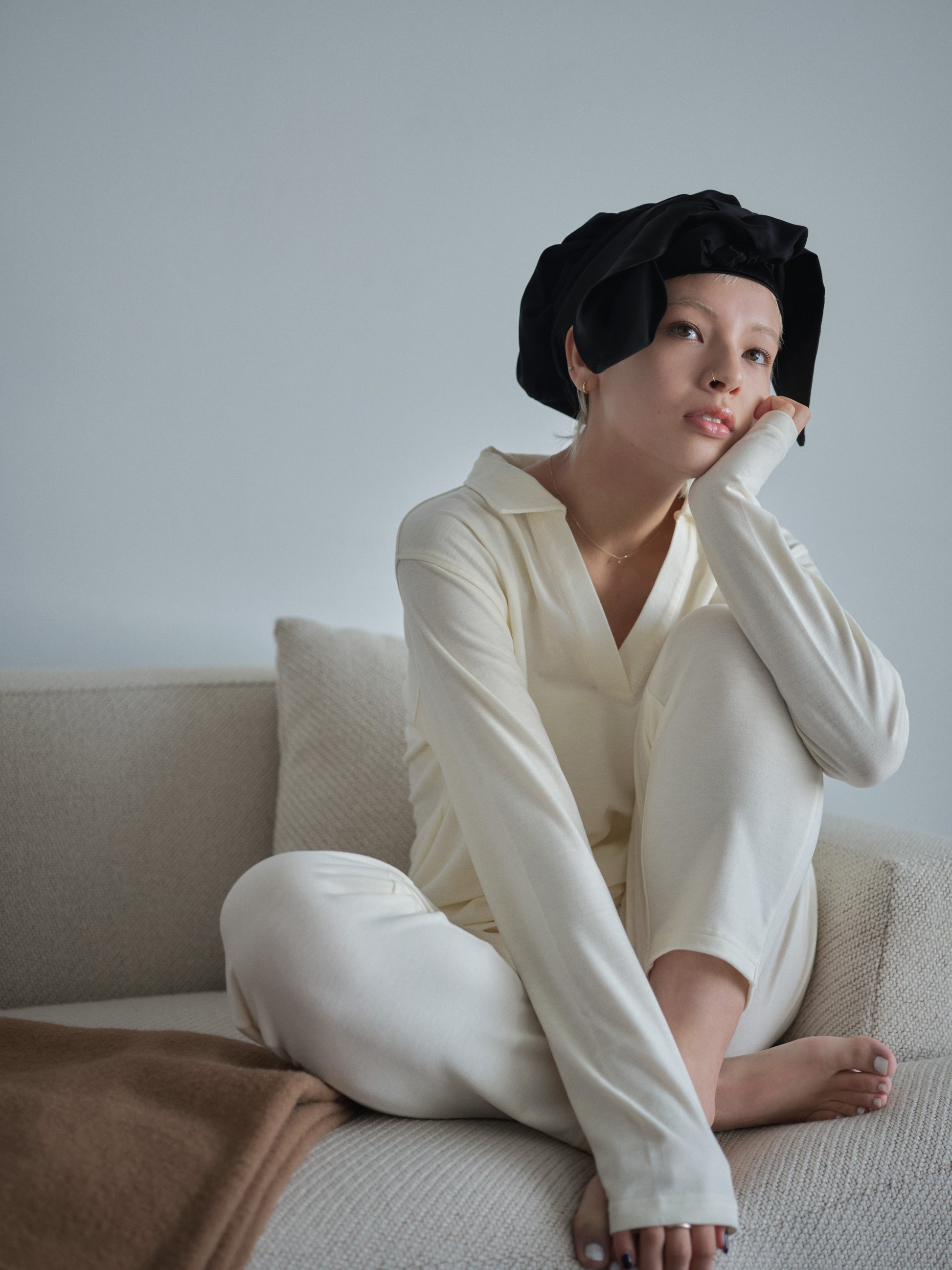 どんな髪の長さの方にも使用しやすく、トップにボリュームのあるデザイン性の優れたナイトキャップです。